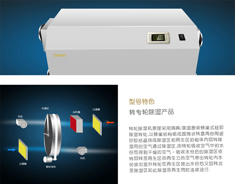 安詩曼是專業(yè)轉(zhuǎn)輪除濕機生產(chǎn)廠家,主要產(chǎn)品有工業(yè)除濕機,高溫烘干機,轉(zhuǎn)輪除濕機,低溫除濕機,吊頂除濕機,商用抽濕機,商用除濕機,工業(yè)抽濕機,工業(yè)干燥機等產(chǎn)品